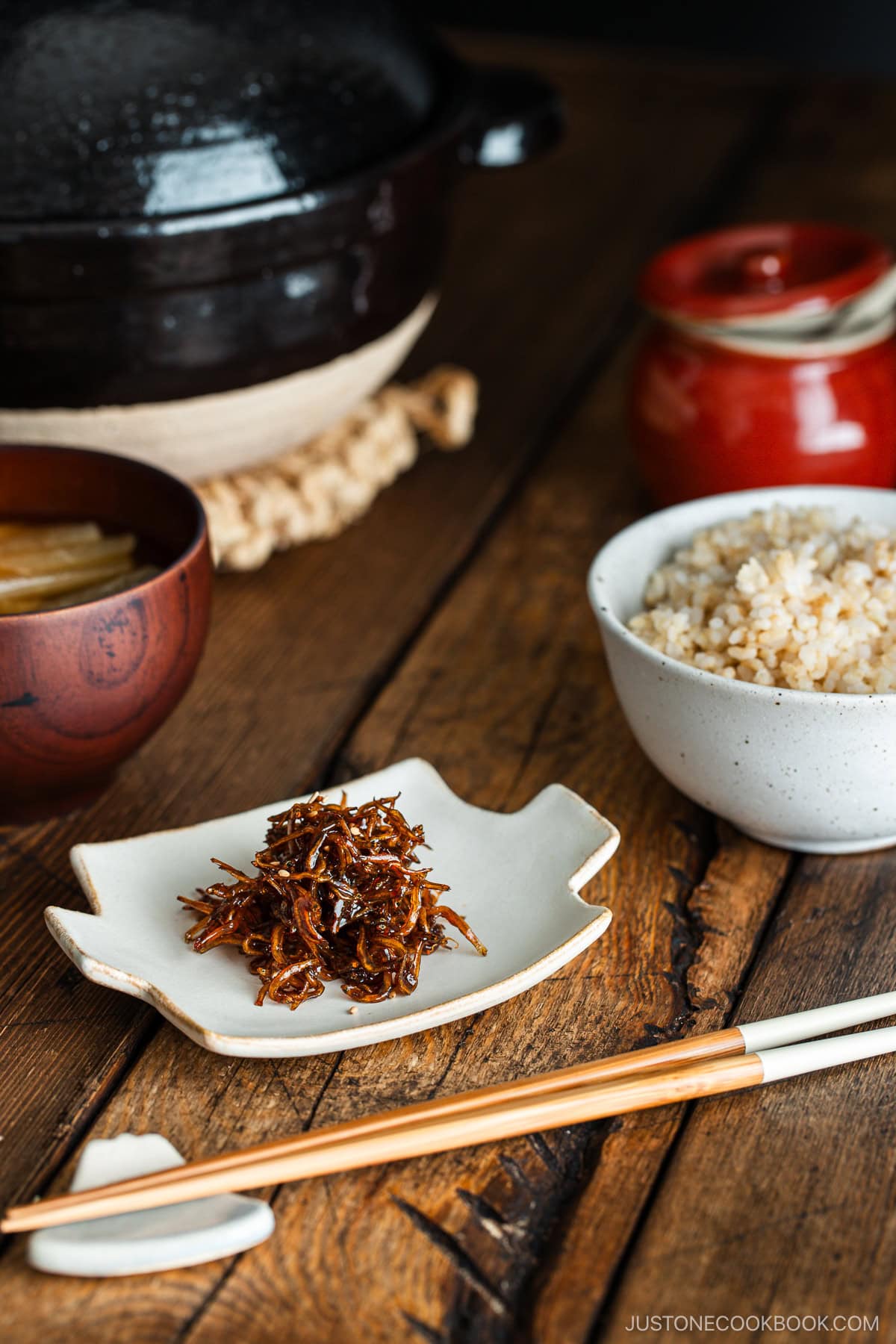 I used chirimen jako in this recipe. These dried sardines just need a quick rinse to wash off the excess salt before cooking. In the US, you can find these dried immature fish in the refrigerated section of Japanese markets and some Asian grocery stores.
