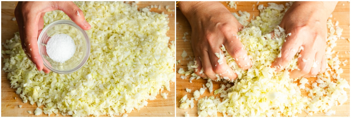 - Sprinkle the minced cabbage with 1 tsp Diamond Crystal kosher salt and massage together with your hands. Transfer it to a bowl and set aside until the cabbage is wilted. Tip: Alternatively, you can blanch or microwave the cabbage for a minute or two to soften the thick and hard leaves. Or, you can skip wilting altogether.
