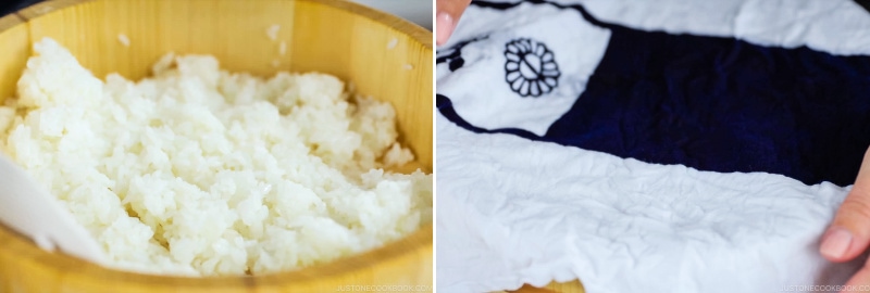 - Once the rice is done cooking, fluff with a rice scooper/paddle. Moisten a sushi oke/hangiri (a round, flat-bottom wooden tub) or a large bowl with water so the rice will not stick. Transfer the cooked rice into the sushi oke and spread out evenly so the rice will cool faster.