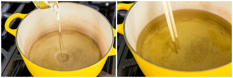 - Heat 3 cups neutral oil to 340ºF (170ºC) in a deep pot over medium-high heat. Stir the oil and check the temperature using a cooking thermometer or cooking chopsticks. (Later on, you can lower to medium heat to maintain this optimal temperature.)